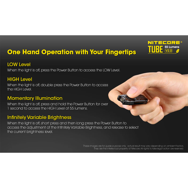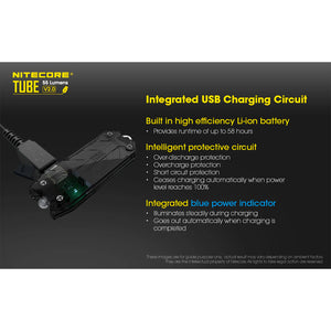 The popular NITECORE Tube keychain flashlight 2nd generation is here with 55 lumen brightness, faster charging, and an improved lockout function. Easily adjust the output of the NITECORE Tube V2.0 to your needs with its variable brightness. Just hold the power button and the light goes from 1 to 55 lumen so it is bright enough for household tasks, outdoor use, and everything in between.